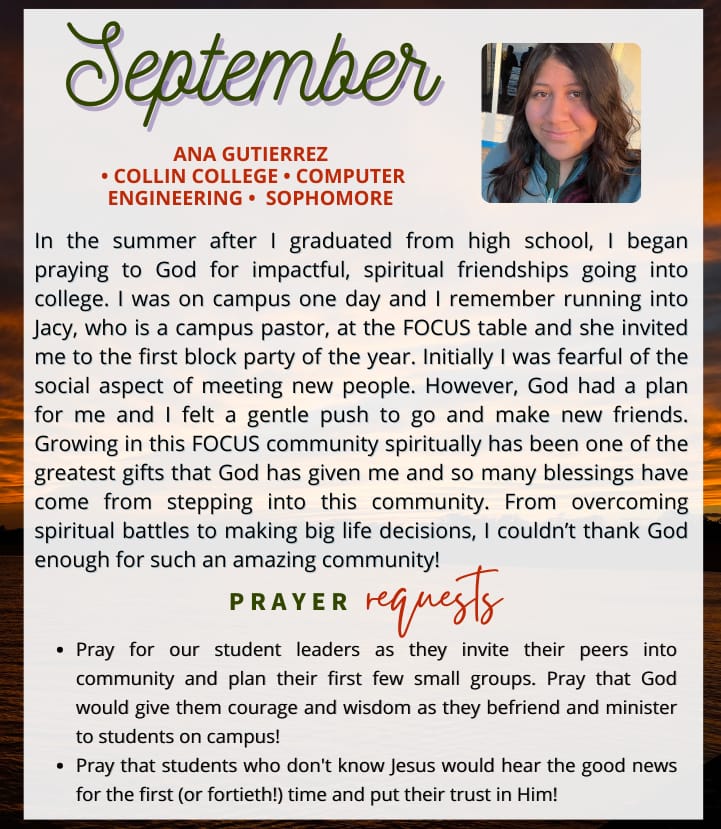 One of my favorite parts of this time of year is getting to know some of the new freshmen who have joined FOCUS. I try to be intentional about spending time with as many of them as I can, hearing their stories and seeing how things are going for them. Sometimes I also meet with students who haven’t yet decided to plug into a campus ministry but are still open to meeting up. The contrast between these two groups of students is often striking.